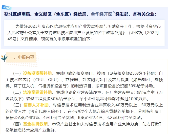 婺城區(qū)經(jīng)商局、金義新區(qū)(金東區(qū))經(jīng)信局,金華經(jīng)開區(qū)經(jīng)發(fā)部,各有關(guān)企業(yè): 為做好2023年度市區(qū)信息技術(shù)應(yīng)用產(chǎn)業(yè)發(fā)展補(bǔ)助與獎(jiǎng)勵(lì)資金工作,根據(jù)《金華市人...