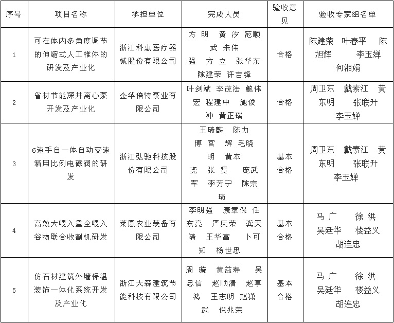 根據(jù)《金華市級科技計劃項目驗收管理辦法》(金市科字〔2015〕83號)規(guī)定,現(xiàn)將浙江科惠醫(yī)療器械股份有限公司、金華倍特泵業(yè)有限公司、浙江弘馳科技股份有限公司、萊恩農(nóng)業(yè)裝備有限公司、浙江大森建筑節(jié)能科技有限公司承擔(dān)的《可在體內(nèi)多角度調(diào)節(jié)的伸縮式人工椎體的研發(fā)及產(chǎn)業(yè)化》、《省材節(jié)能深井離心泵開發(fā)及產(chǎn)業(yè)化》、《6速手自一體自動變速箱用比例電磁閥的研發(fā)》、《高效大喂入量全喂入谷物聯(lián)合收割機(jī)研發(fā)》、《仿石材建筑外墻保溫裝飾一體化系統(tǒng)開發(fā)及產(chǎn)業(yè)化》5個市級科技計劃項目驗收結(jié)果予以公示,接受社會監(jiān)督,公示期從2017年9月26日至10月8日止。任何單位和個人對驗收意見持有異議的,應(yīng)當(dāng)在公示期內(nèi)書面向市科技局提出異議,單位應(yīng)采用書面形式并加蓋公章,個人應(yīng)采用實名提出異議。