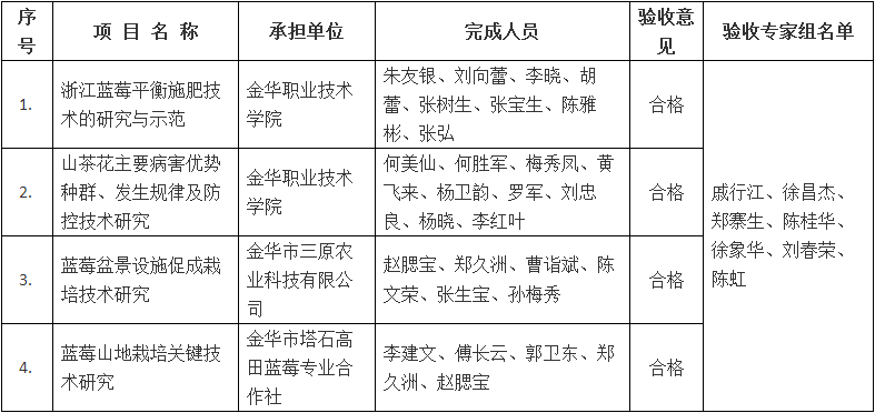 根據(jù)《金華市級科技計(jì)劃項(xiàng)目驗(yàn)收管理辦法》(金市科字〔201583)規(guī)定,現(xiàn)將金華職業(yè)技術(shù)學(xué)院承擔(dān)的《浙江藍(lán)莓平衡施肥技術(shù)的研究與示范市級科技計(jì)劃項(xiàng)目驗(yàn)收結(jié)果予以公示,接受社會監(jiān)督,公示期從2018717日至2018724日止。任何單位和個人對驗(yàn)收意見持有異議的,應(yīng)當(dāng)在公示期內(nèi)書面向市科技局提出異議,單位應(yīng)采用書面形式并加蓋公章,個人應(yīng)采用實(shí)名提出異議。