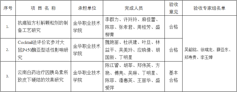 根據(jù)《金華市級科技計劃項目驗收管理辦法》(金市科字〔2015〕83號)規(guī)定,現(xiàn)將金華職業(yè)技術學院承擔的《抗癌驗方杉斛顆粒劑的制備工藝研究》市級科技計劃項目驗收結果予以公示,接受社會監(jiān)督,公示期從2018年7月23日至2018年7月29日止。任何單位和個人對驗收意見持有異議的,應當在公示期內書面向市科技局提出異議,單位應采用書面形式并加蓋公章,個人應采用實名提出異議。