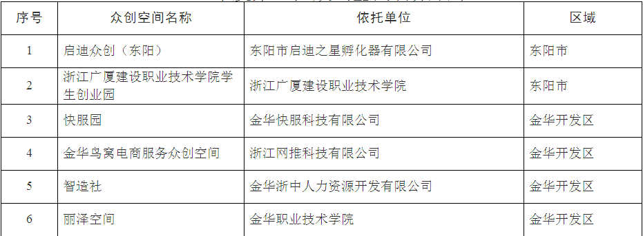 根據(jù)《金華市眾創(chuàng)空間管理辦法(試行)》(金市科〔2016〕70號)規(guī)定,經(jīng)研究,同意啟迪眾創(chuàng)(東陽)等6家單位備案為金華市眾創(chuàng)空間。