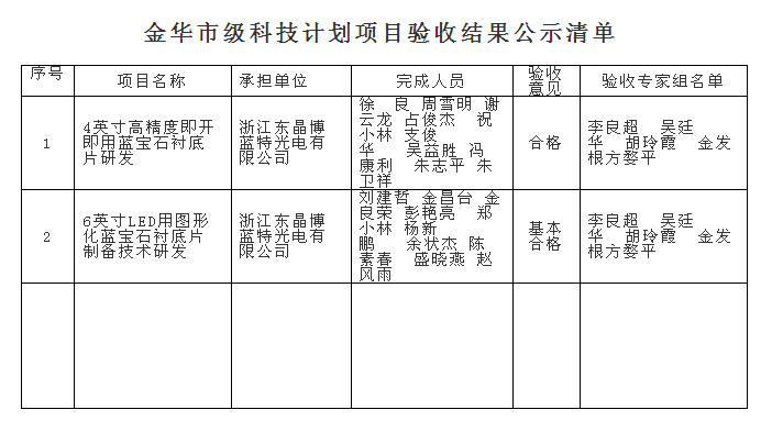 根據(jù)《金華市級科技計劃項目驗收管理辦法》(金市科字〔2015〕83號)規(guī)定,現(xiàn)將浙江東晶博藍特光電有限公司承擔的《4英寸高精度即開即用藍寶石襯底片研發(fā)》和《6英寸LED用圖形化藍寶石襯底片制備技術研發(fā)》2個市級科技計劃項目驗收結果予以公示,接受社會監(jiān)督,公示期從2017年7月31日至8月6日止。任何單位和個人對驗收意見持有異議的,應當在公示期內(nèi)書面向市科技局提出異議,單位應采用書面形式并加蓋公章,個人應采用實名提出異議。
